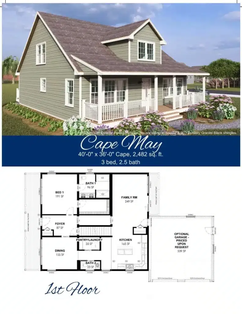 While the kitchen and family room offer an open concept, the dining room and living room provide more traditional spaces. You will find the master suite at one end of the home and the laundry area and 1/2 bath at the other near the family living area. Future plans for the second floor of this home could also include another 3 bedrooms, a sitting room, a full bathroom and plenty of closet space and an additional storage closet.